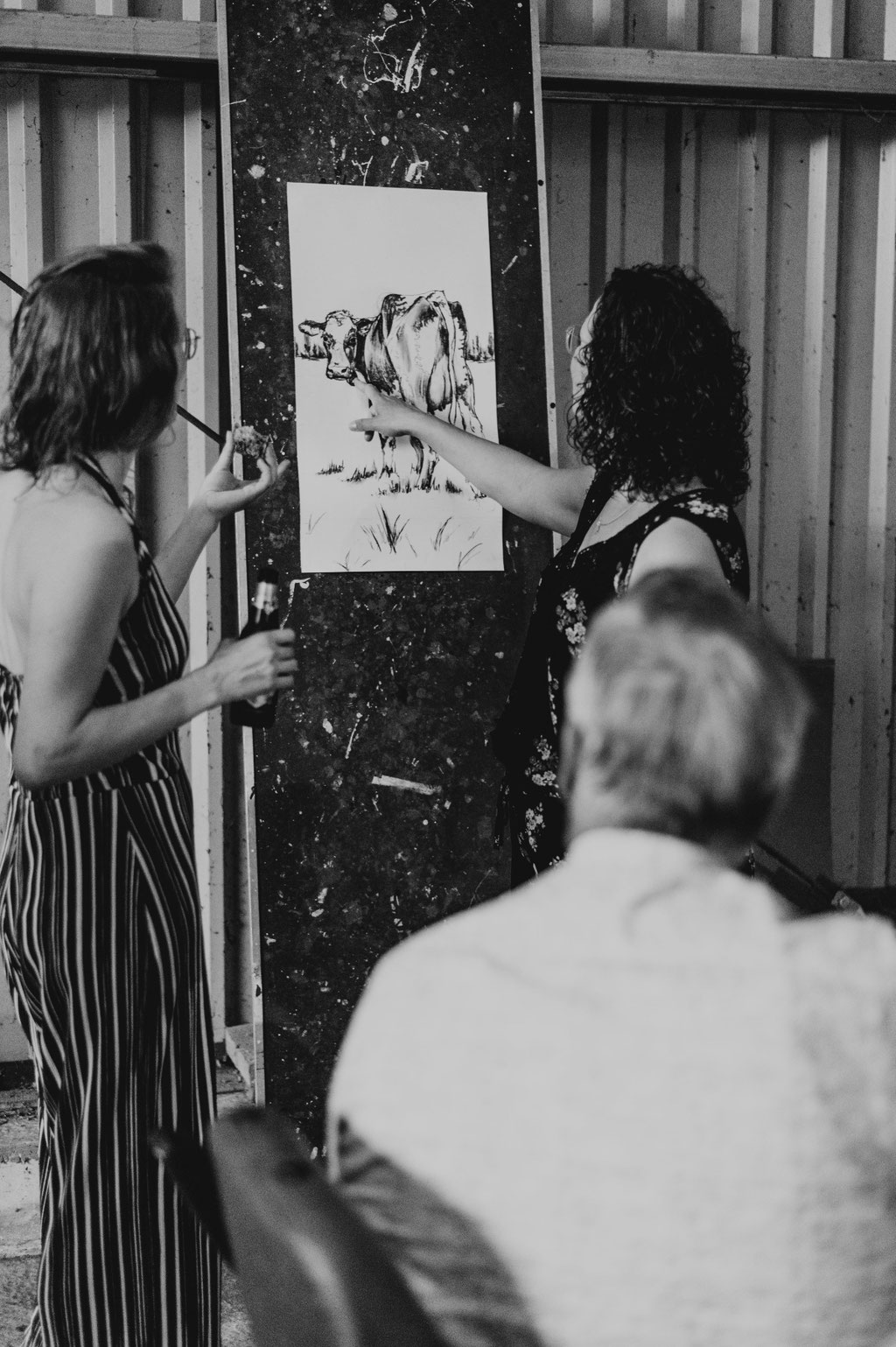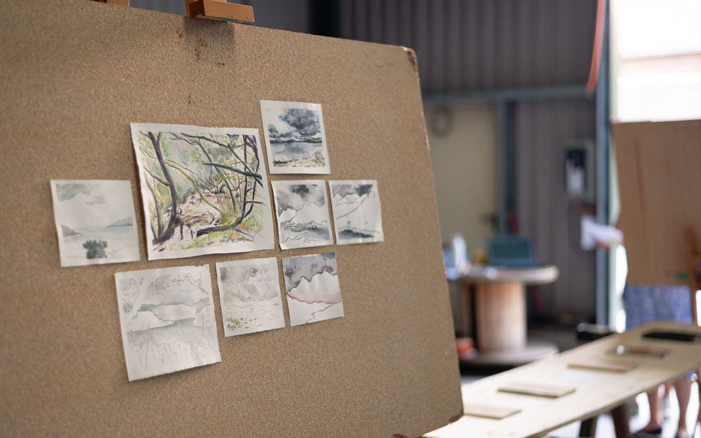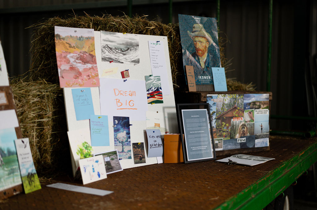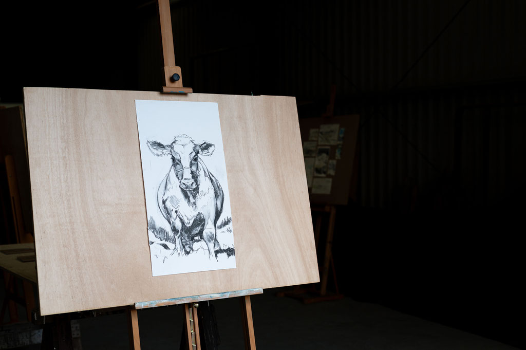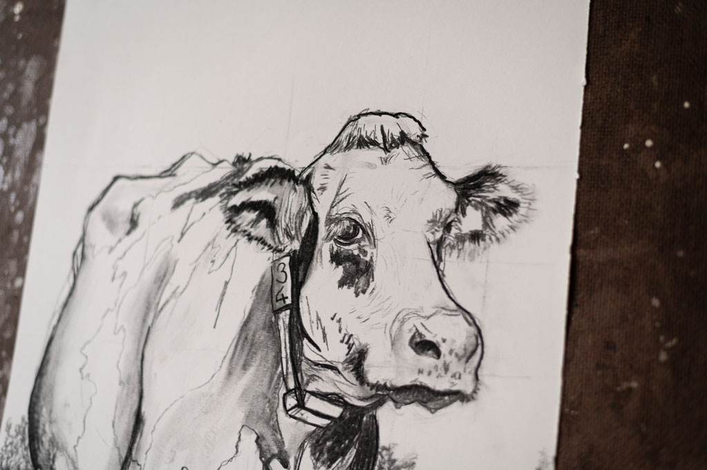 schetsboeken, losse tekeningen, houtskool koeien portretten en allerlei voorwerpen en inspiratie uit mijn atelier. In deze expo liep je het als het ware mijn atelier in, mijn gedachte wereld in